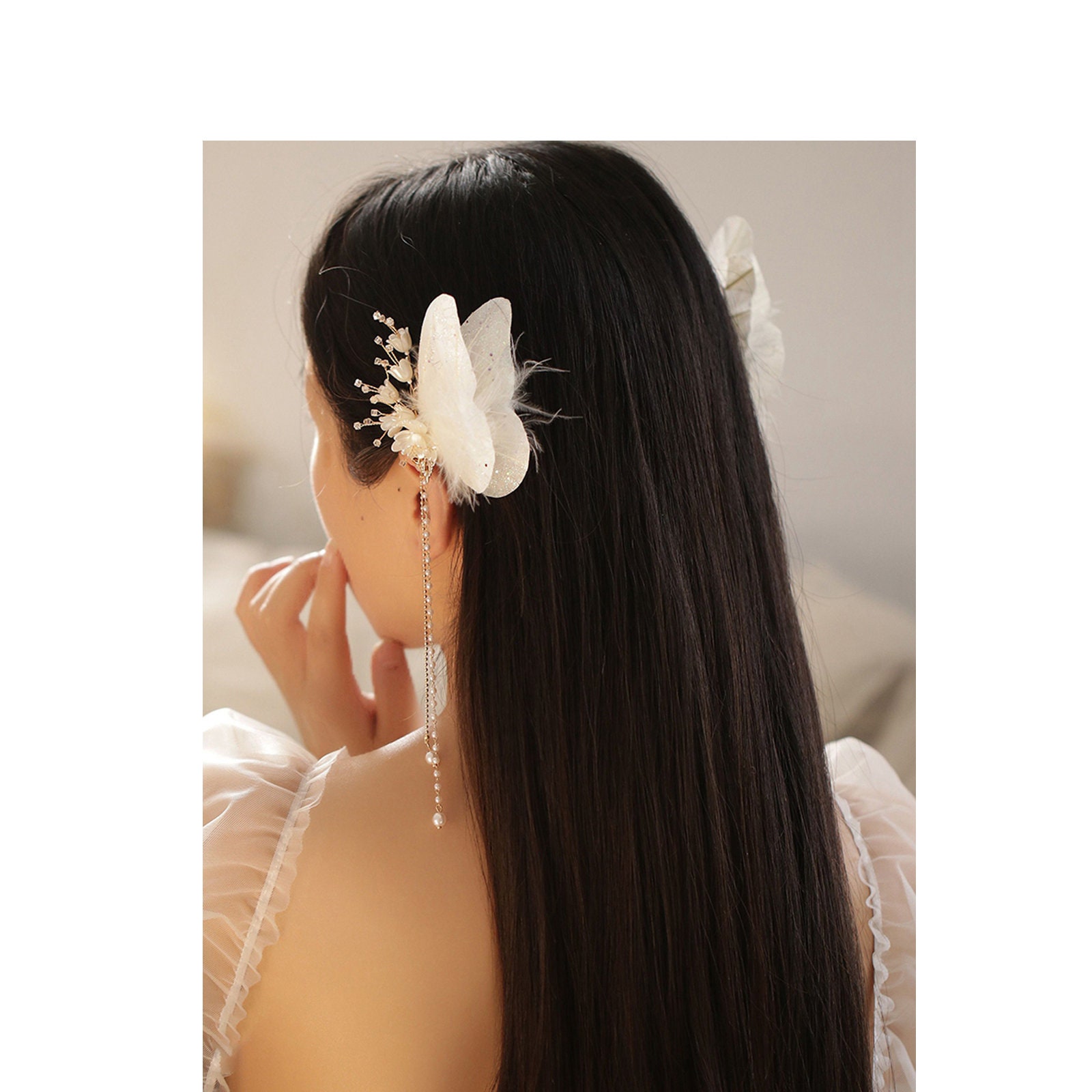 Hanfu Headdress For Women Girls Antique Hair Accessories Side Clip Fringe Pair Plush Feather Hair Clip Earrings Antique Fairy Princess Hair Accessories